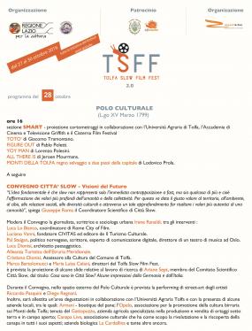 Si terrà a Tolfa, nello storico e prestigioso spazio del Polo Culturale e nel Teatro Claudio, dal 27 al 30 ottobre, il TOLFA SLOW FILM FEST 2.0, la prima kermesse interamente dedicata ad una visione cinematografica “slow”, giunta quest’anno alla sua seconda edizione.