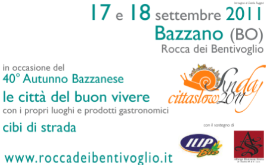 Dopo l’esperienza degli ultimi anni, molto positiva per la nostra comunità, è con estremo piacere che rinnoviamo l’invito a partecipare alla prossima edizione dell’Autunno Bazzanese (quest’anno l’importante traguardo dei 40 anni). La nostra festa, che si richiama a una tradizionale festa dell’uva ininterrotta dal ’700 fino agli anni Trenta del ’900 e che la Pro Loco ha ripreso dal 1972, come sempre organizza concerti, mostre e attrattive enogastronomiche per le quali è gradita la presenza delle Città Slow aderenti alla rete internazionale nelle giornate di sabato 17 e domenica 18 Settembre 2011. Per l’occasione organizziamo una mostra-mercato dei prodotti enogastronomici e artigianali della rete internazionale delle città del buon vivere, alla quale ci auguriamo vorrete aderire attraverso una rappresentanza istituzionale, accompagnata da prodotti e produttori qualificati. Per due giorni il parco antistante la Rocca dei Bentivoglio diventerà il “Villaggio delle Città Slow”, tanti gazebo ospiteranno le proposte turistiche, culturali, sociali e le prelibatezze gastronomiche delle città slow. Saranno inoltre presenti “Gli amici delle Città Slow”, aziende agricole della Valle del Samoggia e alcune esperienze di presidi Slow Food.