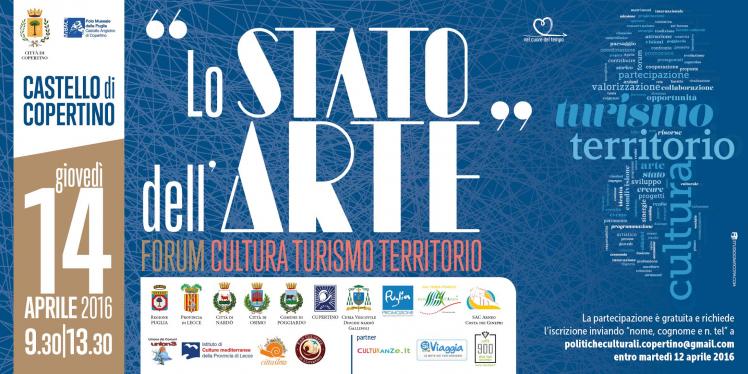 “LO STATO DELL’ARTE. Forum Cultura Turismo Territorio” organizzato dalla CITTÁ di Copertino e dal MiBACT  - POLO  MUSEALE della  PUGLIA  (Castello  Angioino – Copertino)  in collaborazione  con Regione Puglia,   PUGLIA PROMOZIONE, Provincia di Lecce, Curia Vescovile  -   Diocesi Nardò Gallipoli, Istituto  di Culture Mediterranee,  GAL Terra d’Arneo, SAC Arneo Costa del Ginepri, Frati Minori Conventuali, Union 3, Comuni gemellati di Osimo, Poggiardo e Cupertino – California USA ed Associazione Cittaslow